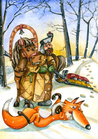 Дед поехал на базар, Кой-какой купил товар, Рыбки свеженькой припас, В сани он сложил запас И, довольный сам собой, Вновь отправился домой. Через лес он держит путь, Не спешит домой ничуть, Небо, знай себе, коптит, Самокруткой дед дымит, И лошадке нет забот, Сани лошадь еле прёт. Тут, откуда не возьмись, Из кустов лиса явись, Носом чутко повела, На дорогу прилегла, Очи ясные прикрыла, Про дыханье позабыла. Дед увидел в тот же миг Рыжей шубки яркий блик. Он лошадку придержал, До лисы в огляд бежал, Тронул лисоньку ногой, Повернул на бок другой. Да лиса не кажет хворь, Терпеливо сносит боль. Дед прошамкал: - Ну, дела, Богу душу отдала, Дармовой нашёл ломоть, Повезло под старость хоть. Славны выйдут рукавицы С этой рыжей-то лисицы, Но, коль выйдет воротник, Прячь, старуха, в ларь язык! Укрощай свой буйный нрав, Ни к чему мне твой устав, Ведь такой подарок клад, В дом войдут покой и лад!