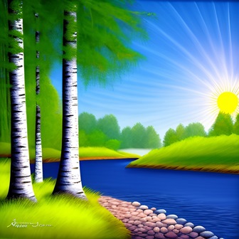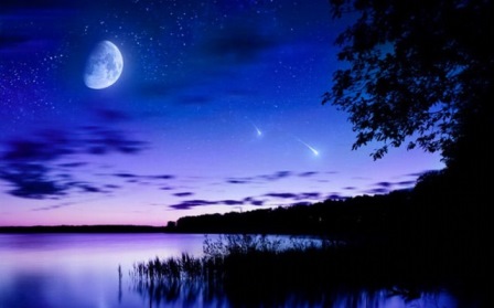 Бор уснул у тихой речки, Вышла полная луна, Засияли звёзды-свечки, У небесного окна. Смотрит в речку дева-ива, Взгляд не сводит от кудрей, Ох, как ивушка красива, Не свести с себя очей! Загляделся в речку месяц, Шёпот тихий на устах, Взгляд на ивушке повесил, Тает месяц на глазах.