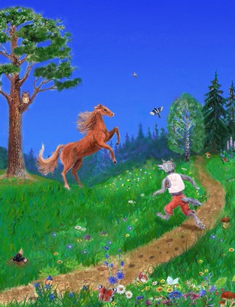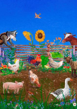 Волк опять не утерпел, Он собою не владел: - И тогда не знать мне бед, Кушать хлеб всегда в обед?! Мужичок в ту злость не впал, Он с улыбкой продолжал: - Хлеб ещё, друг, не едать, Рожь нам надобно убрать, Снопы в поле разложить, Обогреть их, обсушить, И на мельню, в добрый путь, Обмолоть их и обдуть. Волк на месте подскочил, Он в томлении спросил: - И тогда не знать мне бед, Кушать хлеб всегда в обед?! Мужичок был без каприз, В речи он своей не вис: - Ты, волчок, ещё погодь, Словом ты, дружок, не шкодь! Дальше снова ждёт нас труд, Нас мешки с тобою ждут. В них муку мы уместим, И до дому поспешим, Из муки опять же прок, Тесто мы замесим в срок, Отстоит оно и печь, Тут, волчок, дела все с плеч, Ешь ты хлеб и не горюй, В ус себе совсем не дуй! Волк в загривке почесал, Мужику он так сказал: - Я труду, мужик, не рад, Не пойдёт такой расклад, Долгий к хлебушку тот путь, Лапы можно протянуть! Мужичок ответил вмиг, Головою он не ник: - Коль путь к хлебушку не мил, Что ты тут, пред мной, застыл?! На полянке конь стоит, У коня отменный вид. Близок путь к еде, волчок, Не считать тебе дорог! Волк бегом на луг рванул, Пред конём спины не гнул: - Съем тебя сейчас я, конь, Я в делах таких огонь! В жизни конь был дик и смел, Конь пред волком не робел: - Окажи ты, волк, мне честь, На копыте надпись есть. Как зовут меня, узнай, После смерти вспоминай! Волк в отказ идти не стал, Пред хвостом коня он встал. Дело сделал конь без слов, Не жалел своих подков, С лёту принял волк удар, Потерял он речи дар, В лес рванул бегом волчок, Взглядом волк травинки жёг. Вслед ему мужик глядел, Слов простых он не жалел: - Коль желанья нет на труд, Рано - поздно, волк, побьют! Ну, а мне баклуш не бить, В том труде мне дальше жить.