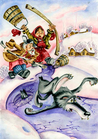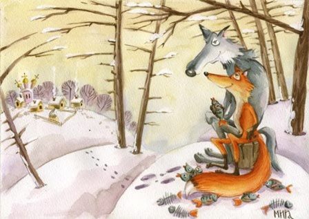 Весь в работе на износ, До саней лису он нёс, Рядом с рыбой положил, Мешковиной дар прикрыл. В темноте лежит лиса, Щурит хитрые глаза. Дед спешит уже домой, Лошадь гонит пред собой. Ей, конечно, невдомёк, Почему спешит дедок, А лисичка, знай, лежит, На рыбёшку ту глядит, Нос её истомой взят, Глазки лисоньки горят, Подхватилась, правда, тут, Довершить позорный труд, Побросала рыбку в снег, Из саней пошла в побег, Собрала её без бед, Здесь и время на обед. Вмиг насытилась лиса В чуткий сон ушла она, И пока лисичка спит, Пулей дед домой летит, Заезжает он на двор И кричит на весь простор: - Эй, жена, выходь к саням, Радуй глаз подарком там И прошу, пошевелись, За дверьми не хоронись! Бабка двери на распах, На него кричит в сердцах: - Языком молоть постой, Всё-то ходишь по кривой! У тебя он стоит грош, Так и треплешь им, что хошь! Улыбнулся хитро дед: - Не в цене такой ответ! Вон, поди, к саням давай, С них накидку скидавай, Там умишком и раскинь, Что к чему сама прикинь! Спину я не зря сгибал, Весь от боли изнывал! Веры нет его словам, Бабка двинулась к саням, Мешковину ту с саней, Вмиг припомнила чертей, Кулаком ему грозит, Дед в смущении стоит, На санях тех рыбий хвост, Худоба рыбёшки в рост! Бабка гневом налилась, Деда хаять принялась: - Ты, я вижу, дед, шутник, Оторвать тебе язык! Уж в бутылке с утреца, Нет преграды для словца, Потому-то так звонишь, Шутки глупые творишь, И тобою знамый стыд, Уж давным-давно забыт?! Дед на бабку не смотрел, Он огнём до пят горел: «Накатила же напасть, Перед жёнкой так упасть! Впрямь, наверно, я дурак, Как пацан попал впросак»! Дед поведал бабке сказ Он покаялся, не раз! Бабка гнев погнала прочь: - Что теперь слова толочь?! Ты давай-ка, дед, уймись, За добром тем не тянись, Нам терять уж не впервой, Бог с ней, рыбой и лисой, И воспрянул духом дед, Он готов обнять весь свет, Начал лошадь распрягать, Смехом дворик оглашать. А тем временем лиса, Приоткрыла уж глаза, Рыбку снова стала есть, Полнить хрустом спящий лес. Тут же волк к ней подкатил, Глазки скромно опустил, Попрошайничать он смел, Действом сим, не тяготел: - Ты бы кумушка-сестричка, Доброта сама лисичка, Угостила б меня рыбкой, Ох, и голоден я шибко! Пред лисою волк стоял, Взгляд его лису ласкал. А лиса ему в ответ: - Для тебя, волк, рыбки нет! Ты меня хоть захвали, Будешь плавать на мели, Лучше сделай резво крюк И свали отсель, мой друг! Волк головушкой качнул, Песню волчью затянул. Повела лисичка взгляд, У лисы такой расклад: «Вот избавлюсь от тебя, Перепрячу рыбку я»! Лик лисичка кажет свой, Говорит она с ленцой: - Ладно, волк, чего уж там, Свой секрет тебе отдам! Рыбку сможешь сам ловить, Станешь скоро сытно жить! - Волк тут уши навострил, Глазки дико округлил, А лиса себе, знай, врёт, Даже глазом не моргнёт. - У деревни речка есть, Рыбы в ней уже не счесть! Прорубь в речке с колесо, Сделай дело, волк, одно, Опусти в ту прорубь хвост И улов твой, не вопрос, Но до зорьки не вставай, Больше рыбки запасай, И живи, не знай забот, Наедай себе живот! Волк от радости вскочил, Когти в наледь запустил: - Ой, спасибочки, кума, Голод свёл меня с ума! Ночки пусть я не посплю, Много рыбки наловлю! Побегу, лиса, скорей, Я до проруби своей! Он глазёнками сверкнул, Рысью к реченьке рванул. А лисе не в тягость бред, Говорит ему во след: - До чего же глупый волк, В голове его рассол! Только волку мыслить грех, Он настроен на успех, Тот секрет теперь ра